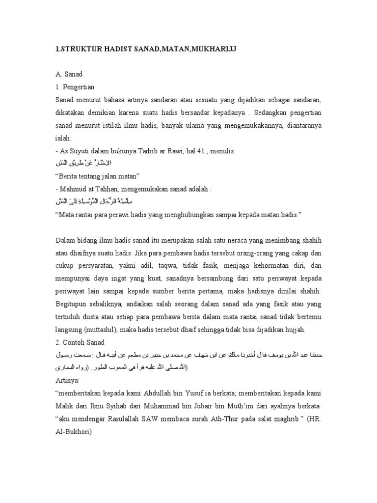 Maksud ketersambungan sanad adalah baliwa setiap rawi hadits yang. Sanad, matan dan mukharrij b. Dari pengertian ini penyebutan sanad hanya berlaku pada serangkaian orang dan tidak berlaku pada diri pribadi seseorang. Peserta didik dapat menjelaskan pengertian sanad, matan dan rawi. Dalam pembahasan ilmu hadits, sering kali kita mendengar istilah sanad, matan dan rawi.